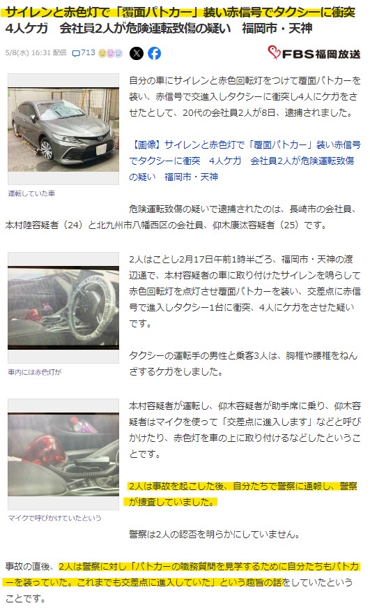 @yucchisannさすが我が故郷、修羅の国。 サイレンと赤色灯で「覆面パトカー」装い赤信号でタクシーに衝突 4人ケガ 会社員2人が危険運転致傷の疑い 福岡市・天神|日テレNEWS NNN news.ntv.co.jp/n/fbs/category…
