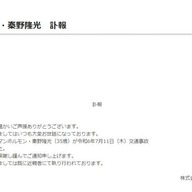 | お笑いコンビ「マンホルモン」秦野隆光さん(35)死去 交通事故で …芸能事務所「太田プロダクション」は17日、同社所属のお笑いコンビ「マンホルモン」の秦野隆光さんが、交通事故で死去したことを明らかにした。35歳だった。 (出典:) |
