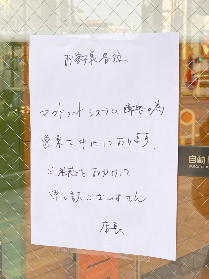 @DoodlingTweeterマクドナルドのシステム障害って今日もまだ直ってないのね🍔❎ マクドナルド日吉駅前店は完全閉店してた。 現金のみでも再開できないレベルの障害なん⁉️ pic.twitter.com/ABYMjLF8FU