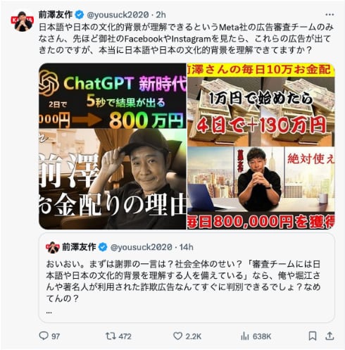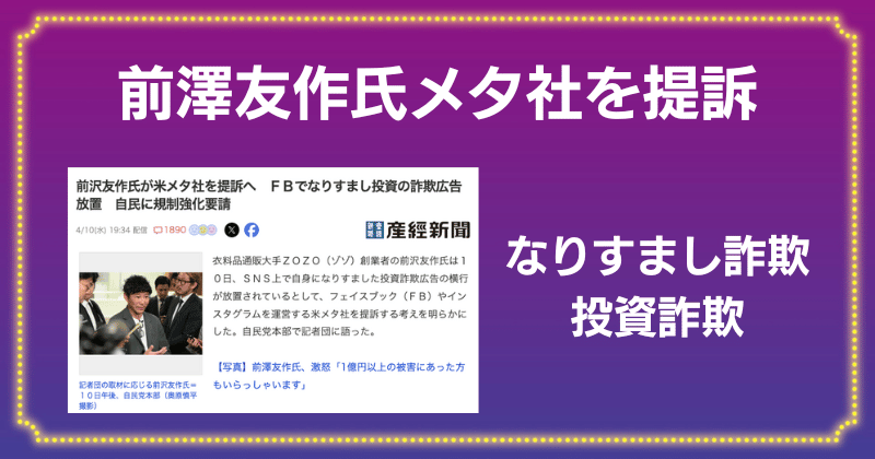 SNSで前澤友作氏ら著名人をかたり詐欺、被害者らMeta日本法人を提訴 2千万円賠償請求 …「フェイスブック」や「インスタグラム」 で前澤友作さんら著名人になりすました詐欺広告が増えている問題で、被害者4人が25日、フェイスブックなどを運営… (出典:ラジトピ ラジオ関西トピックス) |