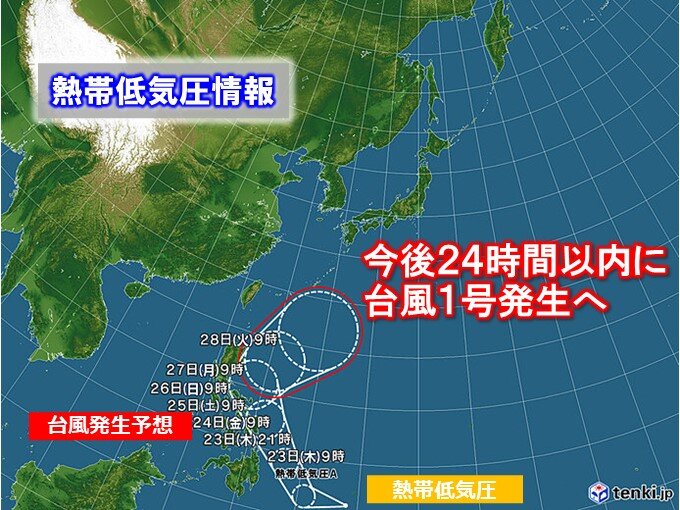 台風1号発生へ 進路予想 九州~本州離れていても大雨に 雨・風シミュレーション27日(月)~28日(火)【台風情報2024最新】 …■24日午後6時までに台風1号に発達する見込み23日にフィリピンの東で発生した熱帯低気圧は、24日(金)午後6時までに台風に発達する見込みです。午後… (出典:MBC南日本放送) |